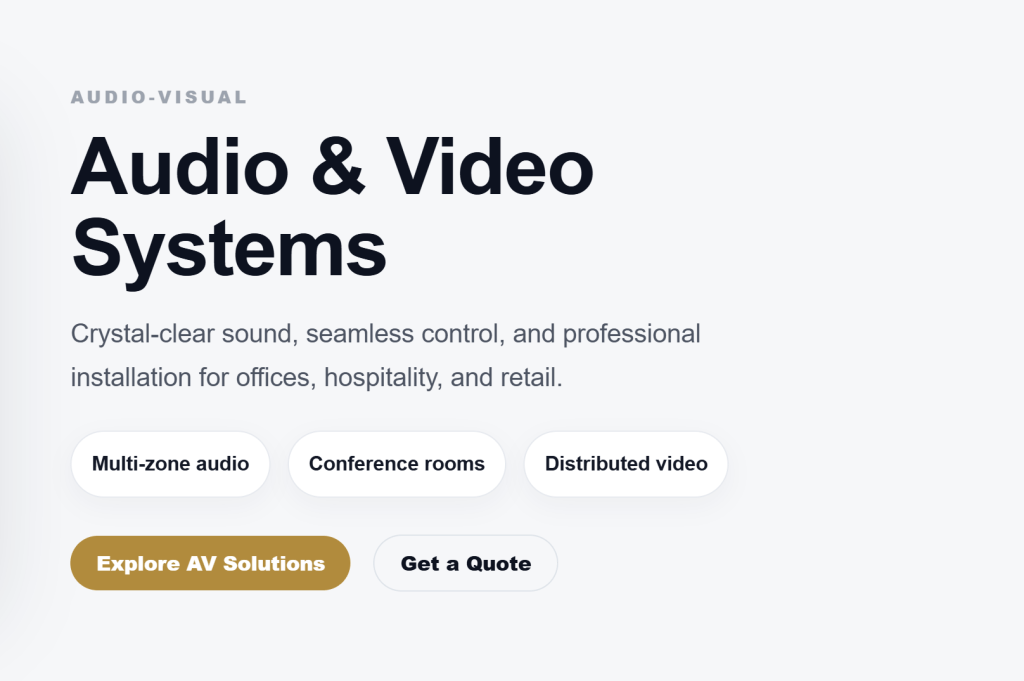 Certified install structured cabling, surveillance systems, access control, Wi-Fi, and AV solutions with clean execution and full system integration.